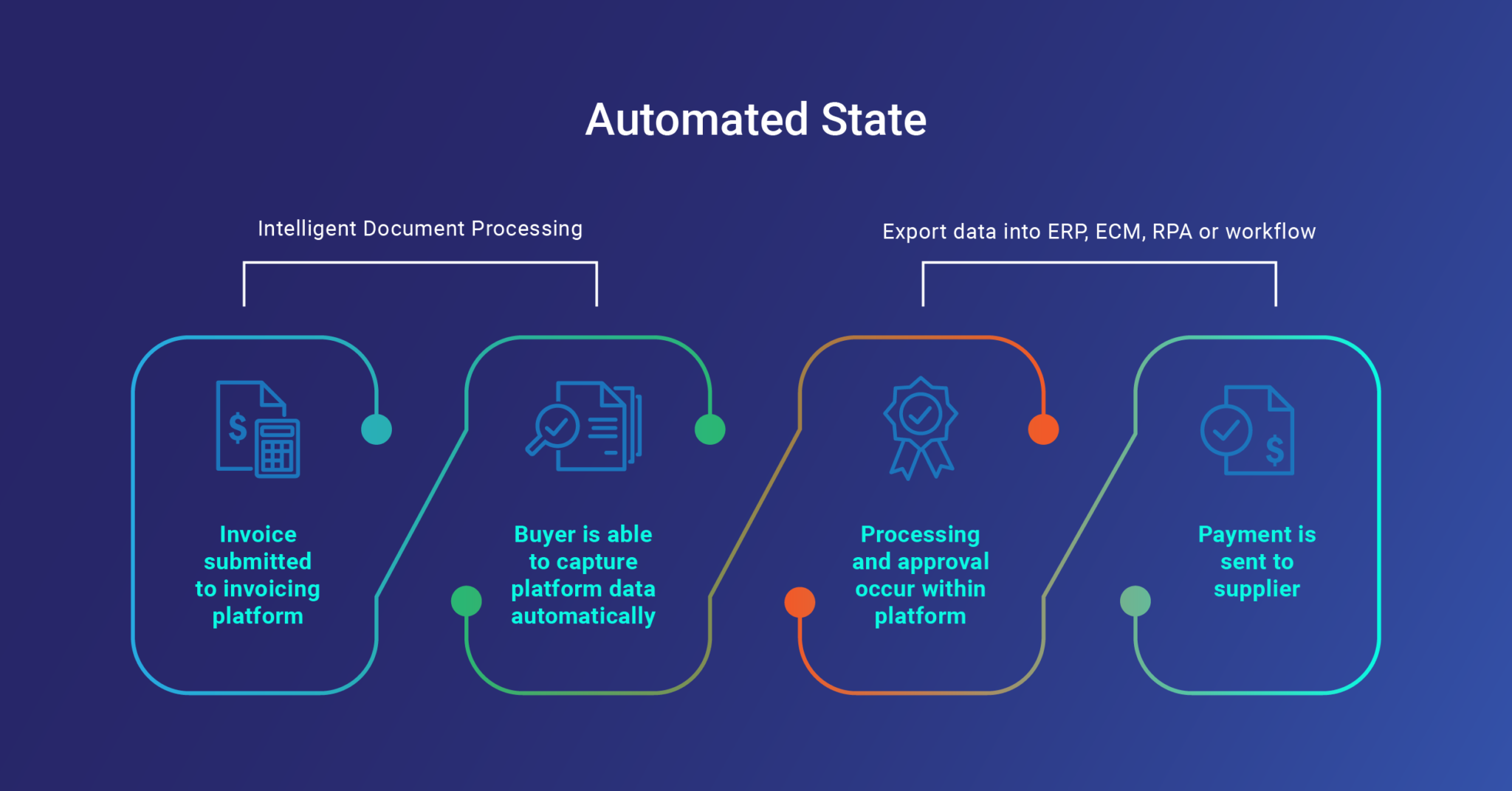 Operational efficiency is critical to success. This means – no matter what size of business you are – shedding manual processes and automating repetitive and mundane tasks is necessary. Digital transformation and streamlining workflows will minimize lost invoices and documents, supplier questions, and human errors while speeding up approvals and payments. The benefits don’t stop there – CFOs and Controllers will have deeper insights to plan and budget better using analytics, and companies can capitalize on vendor discounts with on-time or early payments. The cost savings can have a major impact on the bottom line. Here’s what the IPA process looks like: