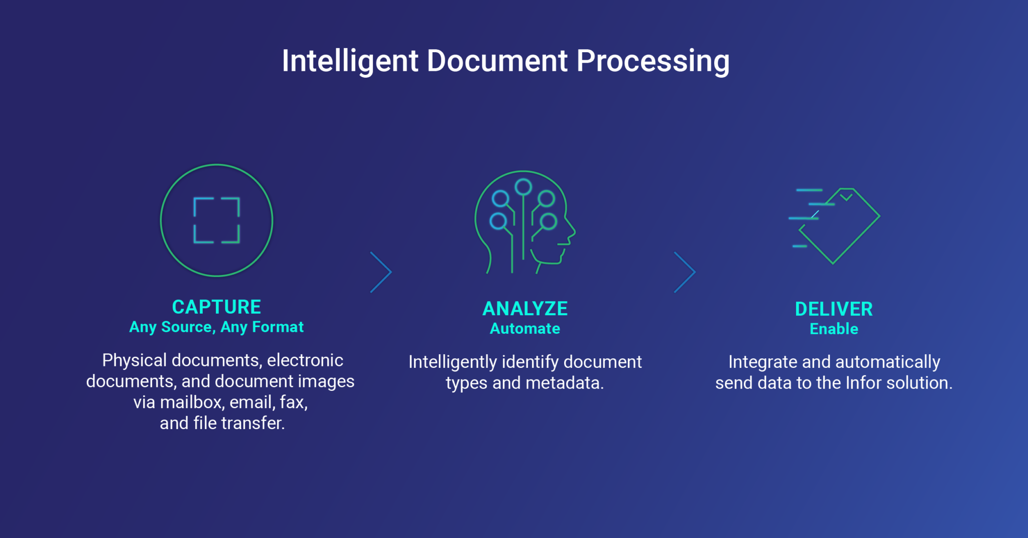 Customers who have high-value, high-volume documents, either electronic or paper, gravitate towards this solution to easily onboard data into their existing Infor solutions to accelerate business processes, drive efficiencies and lower costs. The solution is offered in the cloud, on-premises, or hybrid environments for document capture, classification, data extraction, validation, and export into any ERP that integrates with Infor Document Management.