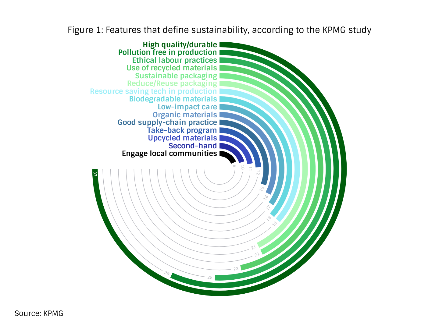 What exactly is sustainable fashion? Sustainability means different things to different people. A recent study carried out by KPMG shows a variety of features defining sustainability.